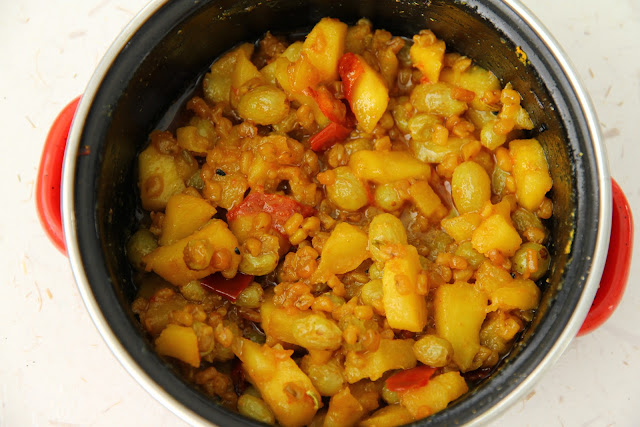 - Place the plums, crystallised ginger and honey in a pan and cook on a low heat, stirring occasionaly until the plums are slightly soft.